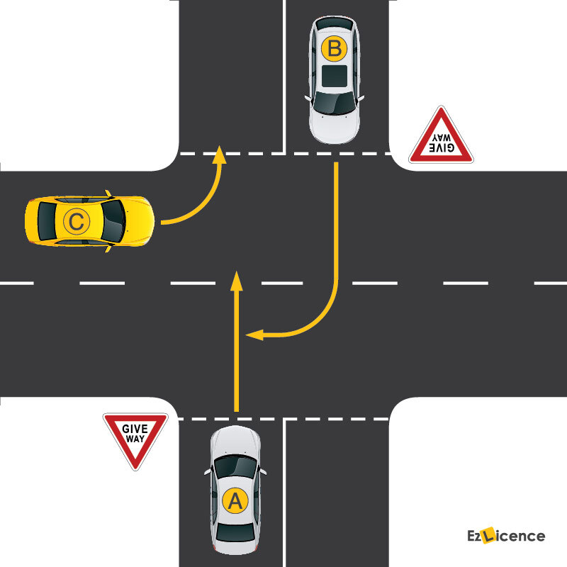 - You are driving vehicle A. Which vehicles must you give way to? -> 44.3% incorrect response rate