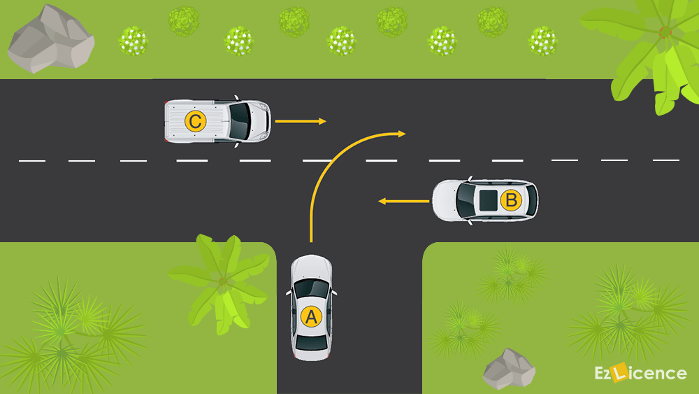 If turning right at a T-intersection (as shown in Car A) must you give way to vehicles approaching from both the left and right?