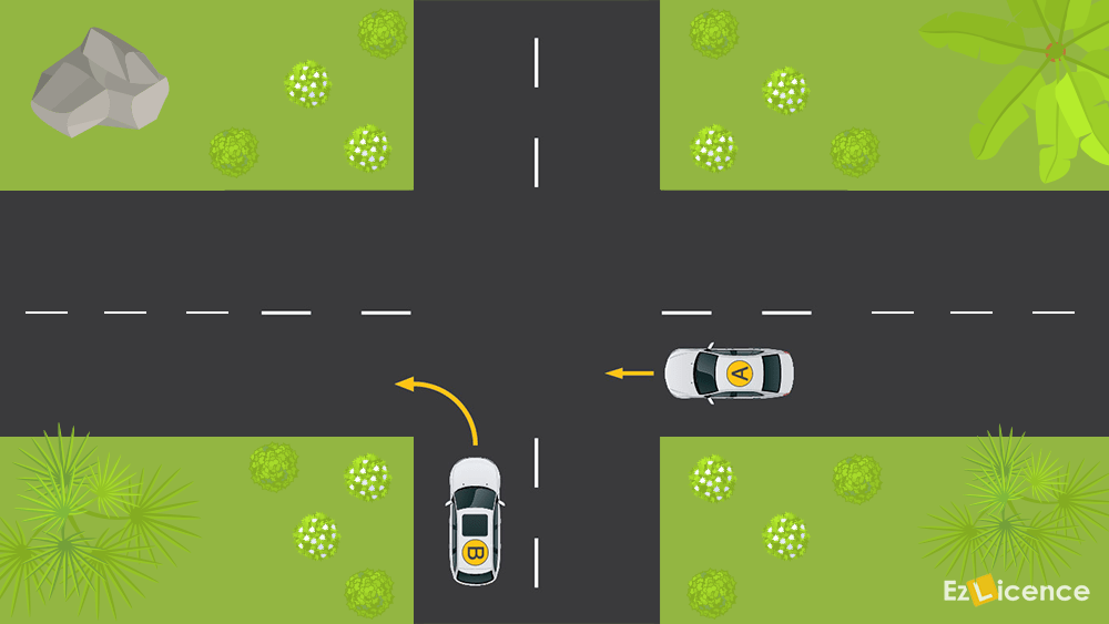 You are in car A and are going straight ahead through the intersection. Who should give way?