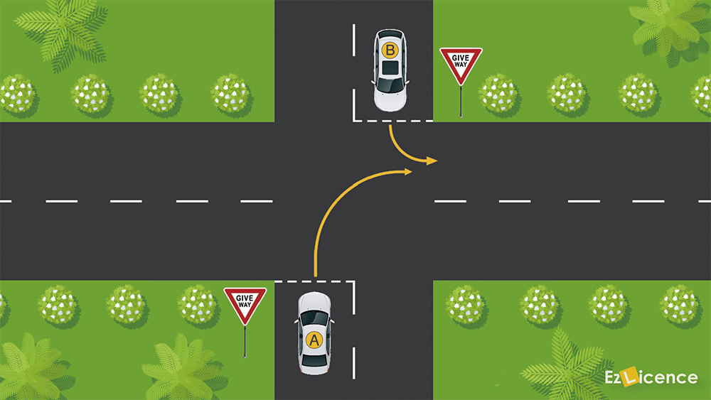 In this diagram both vehicles A and B must pass through GIVE WAY signs before entering the intersection. Which vehicle goes first? | EzLicence
