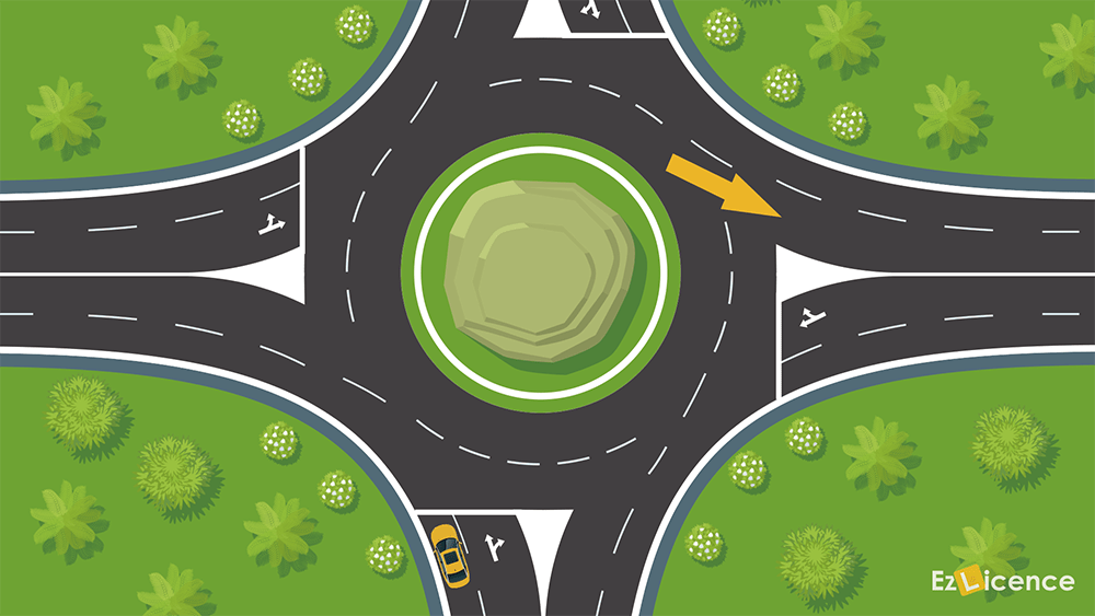 The yellow car wants to turn right and exit the roundabout in the street indicated by an arrow. Is the car positioned in the correct lane to do this?
