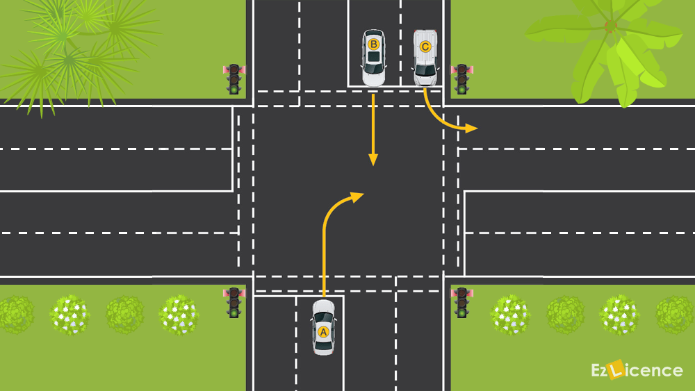 Car A wants to turn right at an intersection with green traffic lights. It should indicate and -